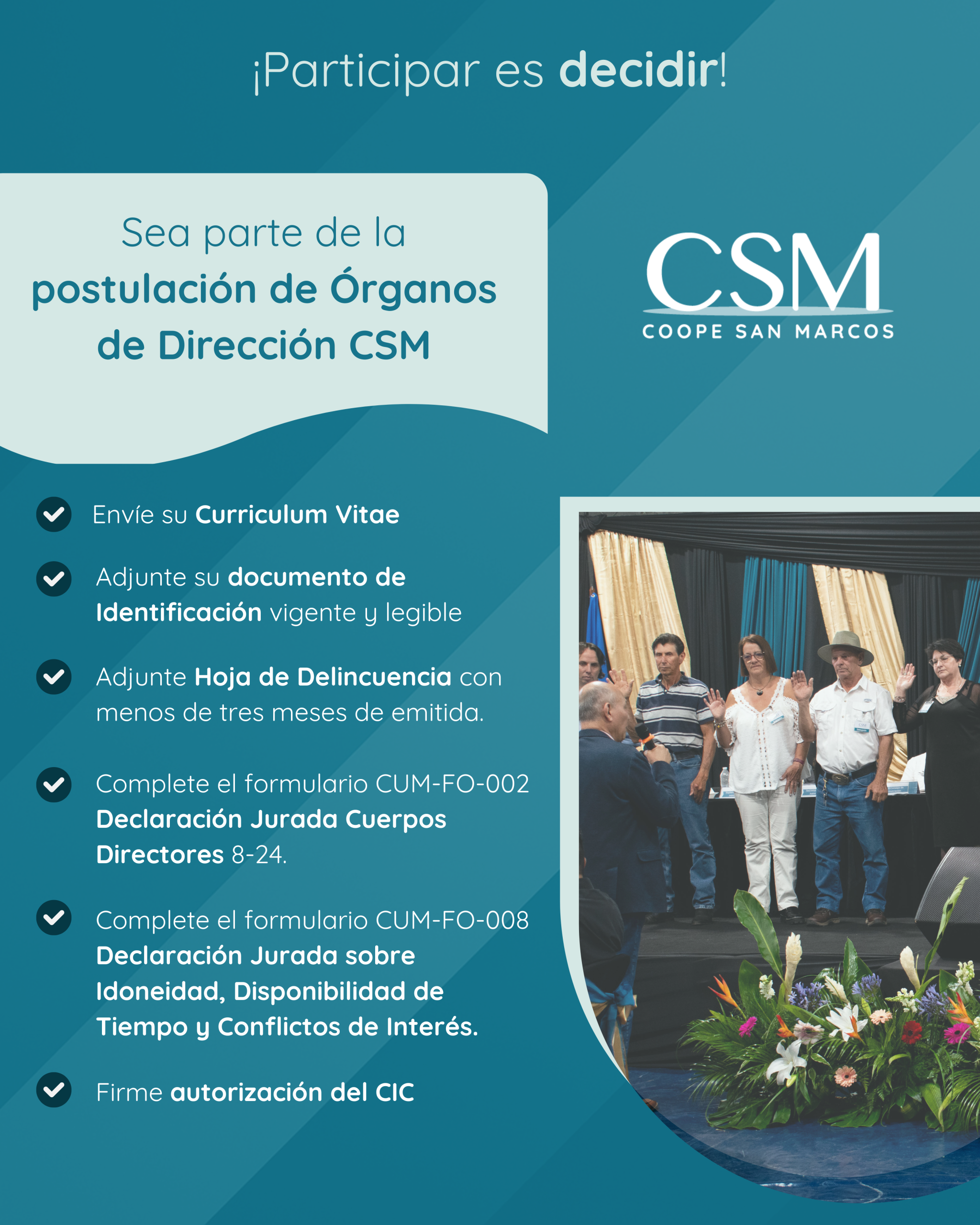 A continuación, se facilita los formularios necesarios para la postulación a los Órganos de Dirección, asegurando la igualdad de condiciones para todas las personas interesadas en participar. El propósito de este espacio es facilitar el acceso oportuno a los lineamientos del Proceso Electoral 2026 de Coope San Marcos R.L., en apego a la normativa interna y a los principios de transparencia, participación y democracia cooperativa.